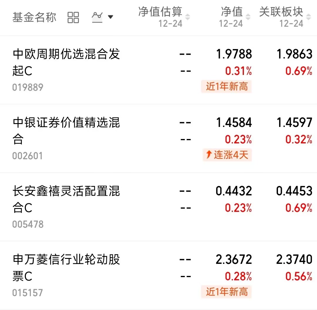 今天的行情表现还不错,三大指数集体出现上涨,上涨超过4000多家。有色资源继续表现,中欧周期优选今天上涨2.39%,连续多日上涨。$中银证券价值精选混合(OTCFUND|002601)$和$长安鑫禧灵活配置混合C(OTCFUND|005478)$上涨0.23%,$申万菱信行业轮动股票C(OTCFUND|015157)$上涨0.28%。