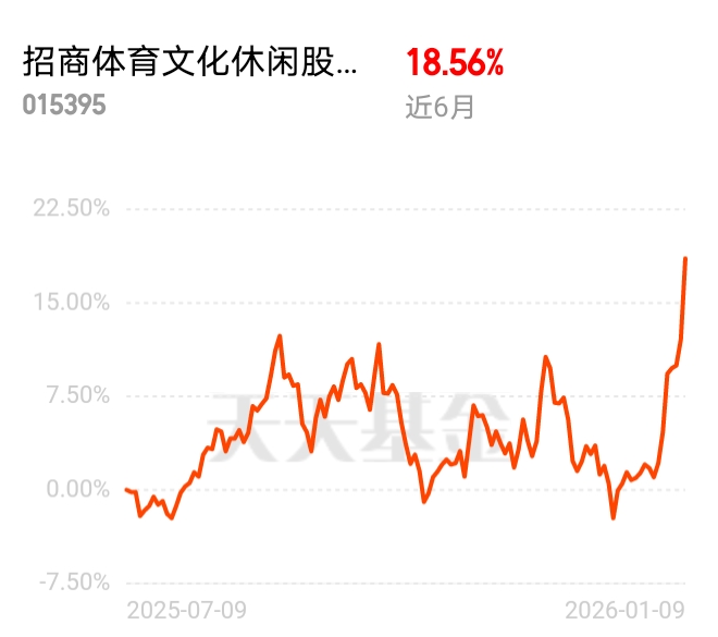 GEO 概念热度一路走高,AI 应用落地带动传媒行业增速惊人,招商体育文化休闲股票 C 紧跟风口。市场轮动加速,成分股蓝色光标、浙数文化受益,估值涨近 5%,近 6 月 18.56%,春节前政策加持,后市可期。$招商体育文化休闲股票C$