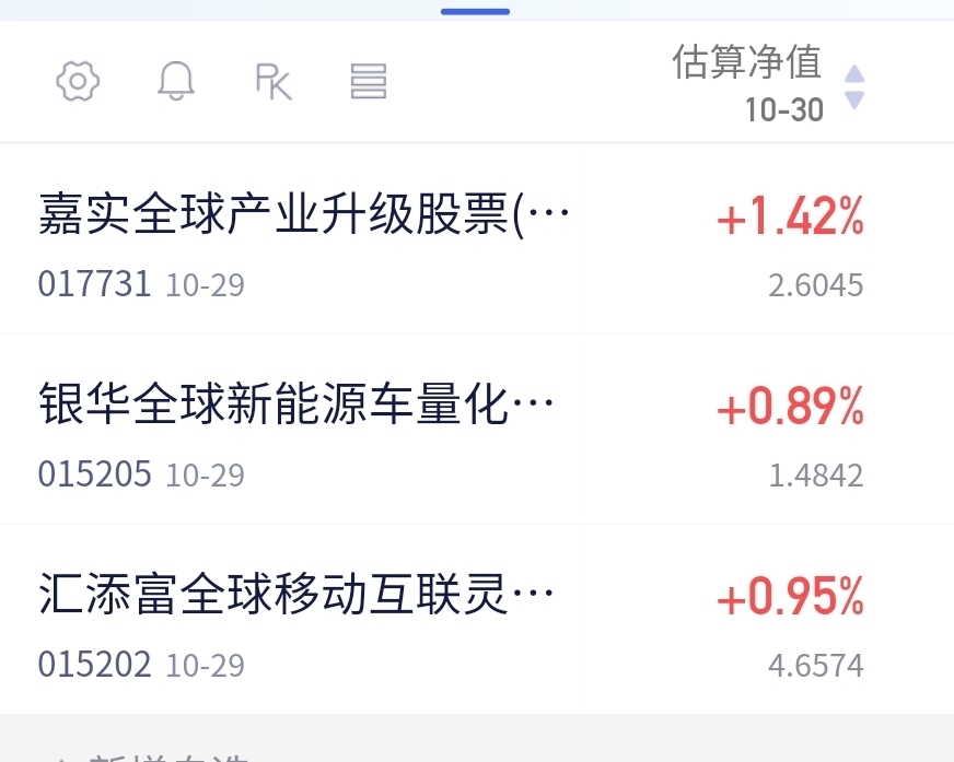 10月30日海外基金估值更新:昨晚纳斯达克指数涨0.55%,$嘉实全球产业升级股票发起式(QDII)C$ 估值涨1.42%有望五连涨,近3个月涨32.69%、近6个月涨71.02%,业绩很出色。