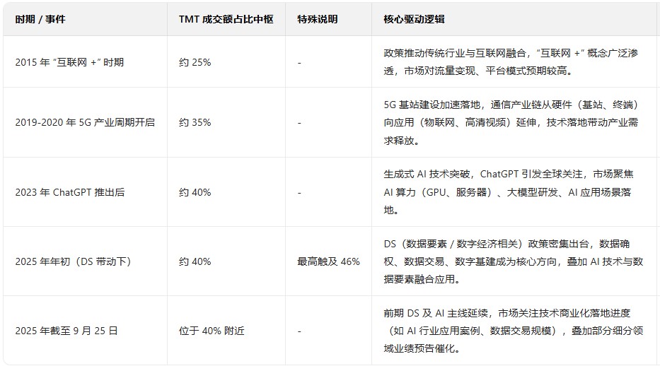 图:历次科技行情,TMT成交额占比中枢情况