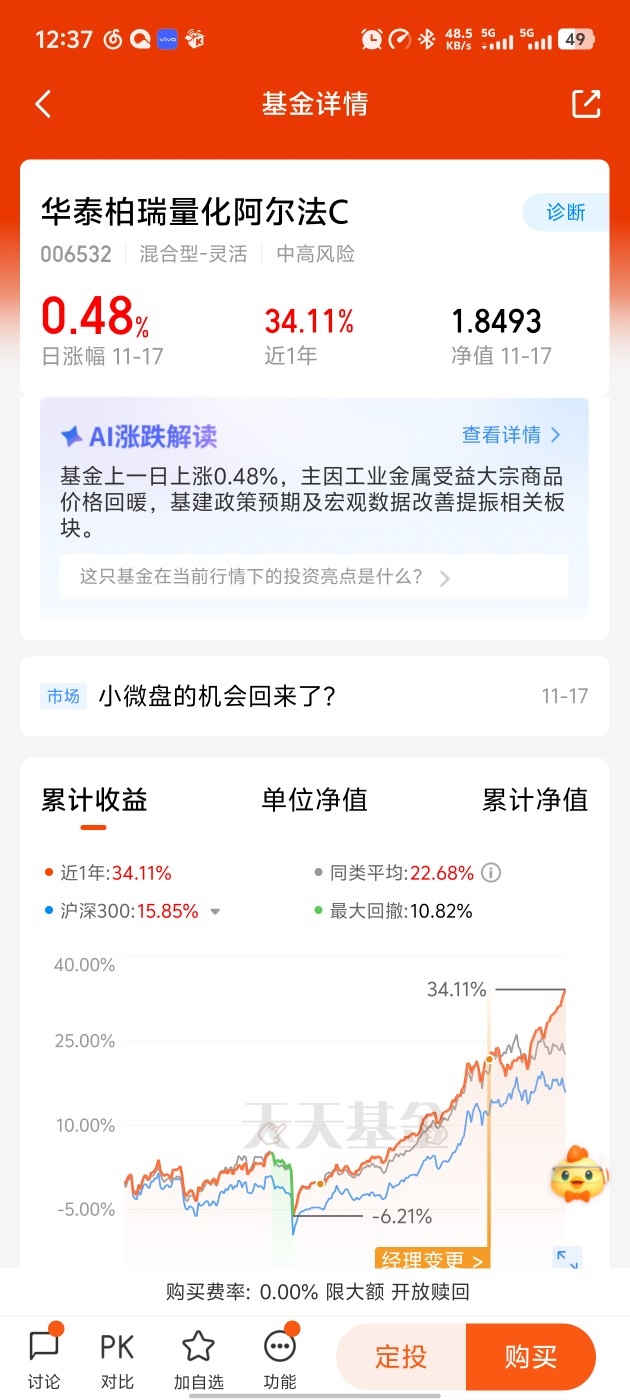 现在市场进入宏观叙事真空期,科技板块前期涨太多现在有点乏力,没什么明确的大方向,题材炒作此起彼伏,这正好给量化微盘策略提供了发挥空间。11月小微盘胜率本来就高,今天行情也没让人失望,整体稳步上涨,资金承接力很强。普通人想参与又怕踩坑,华泰柏瑞就很合适,它家量化策略口碑好,能适应微盘的高波动,自动选股择时,还能分散风险,不用自己费脑子盯盘,小额就能上车,挺香的。