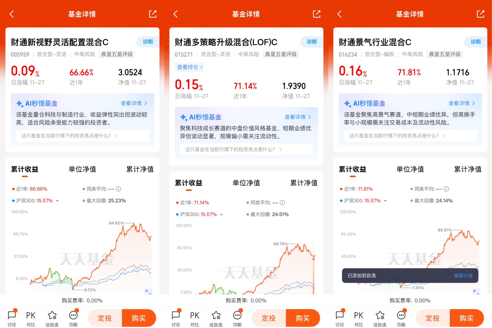我的基金投资经历超过6年,具有一定的风险承受能力,投资目标是资产增值助力将来养老,因此注意发现绩优基金进行定投。沈经理管理的这三只基金,近一年、近三年收益回报,在同类基金中都排名前4%,表现非常优异,值得长期布局!
