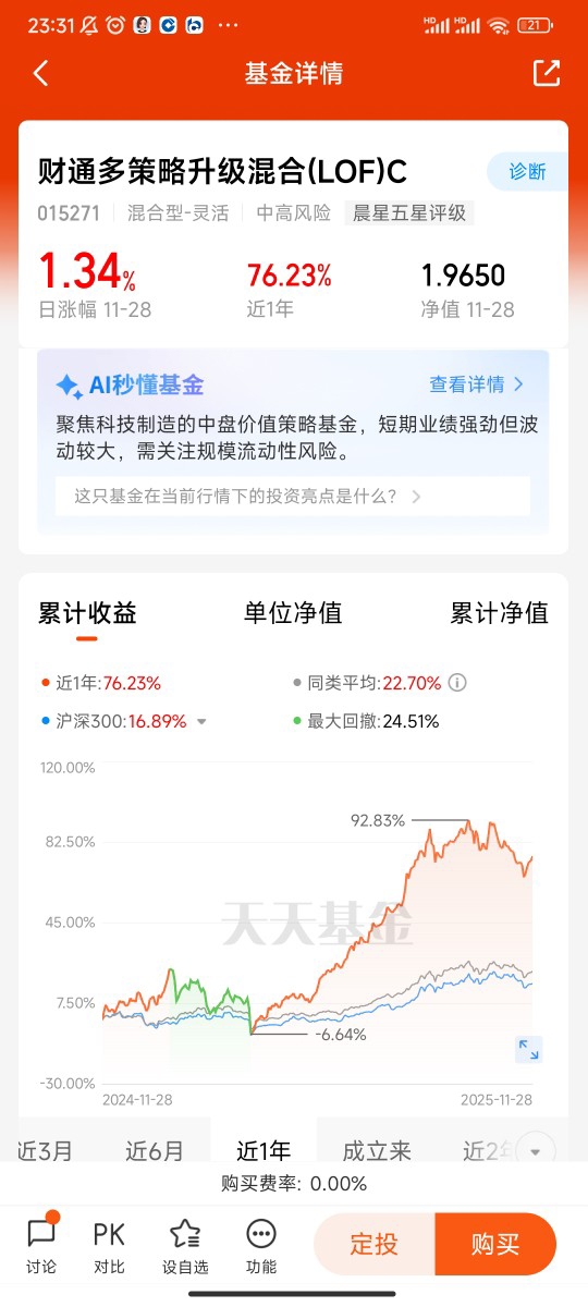 优秀的策略执行,离不开对市场变化的动态适配,这也是平衡风险与收益的关键。混合基金的核心优势在于资产配置的灵活性,而财通多策略升级混合(LOF)C将这一优势发挥到极致:当市场处于上涨周期时,基金适当提升股票仓位,聚焦高景气赛道的盈利增长机会,充分享受市场上涨红利;当市场进入震荡调整期时,基金则通过降低权益仓位、增加低波动资产配置,或切换至防御性行业,有效控制回撤风险。以2025年市场波动为例,基金在近1个月经历-9.48%的短期调整后,迅速实现反弹,11月28日单日涨幅达1.34%,展现出极强的行情适配能力与风险抵御力。这种“顺势而为、逆势防守”的动态调整,避免了“被动承受市场波动”的尴尬,让风险控制与收益获取形成良性循环。