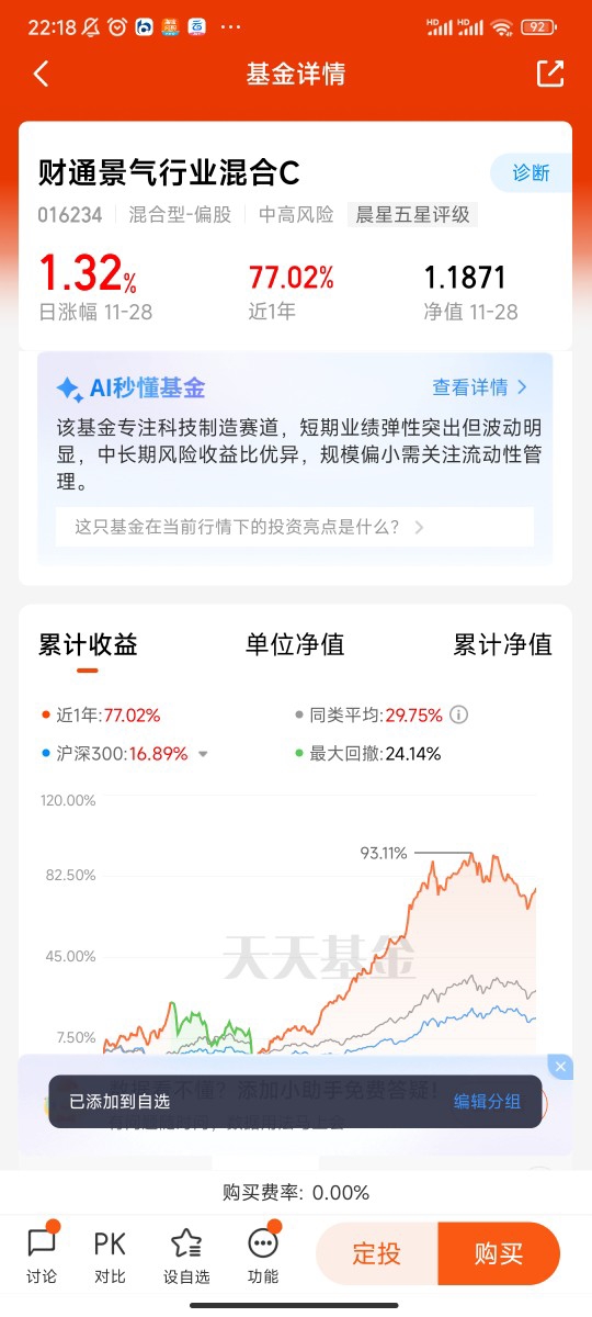 基金经理的主动管理能力,是平衡机制能否落地的关键支撑。优秀的管理人既能在市场上涨时捕捉收益机会,又能在回调时控制回撤风险。财通多策略升级混合(LOF)C的基金经理沈犁任职期内收益达66.75%,其管理逻辑中蕴含着鲜明的平衡思维:通过增加行业分散度提升组合均衡性,借助不同板块的负相关性对冲波动;对持续兑现业绩的绩优股放宽短期估值容忍度,同时避免过度追逐短期涨幅过高的标的,坚守“风险收益比”核心原则。这种管理风格下,基金展现出亮眼的长期业绩:成立以来收益68.94%,近一年收益73.94%,在同类8056只基金中排名第261位,即便近一月出现6.38%的回调,也远低于纯权益基金的平均回撤水平,体现了“涨得多、跌得少”的平衡特质。