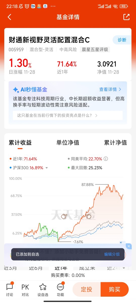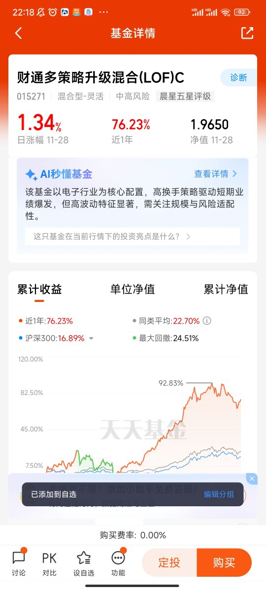 在风险边界明确后,资产配置与策略组合成为实现平衡的核心工具。单一资产难以应对复杂市场环境,而不同属性资产的“涨时不同步、跌时不同幅”特性,正是对冲风险的关键。财通多策略升级混合(LOF)C的核心优势在于其“多策略并行”的配置逻辑:一方面通过覆盖电子、半导体、制造业等多个领域的分散持仓控制单一行业风险,前十大重仓股涵盖金诚信、纳芯微、沪电股份等优质标的,单一持仓占比最高不超过8.3%,有效避免了行业黑天鹅对组合的冲击;另一方面灵活运用成长策略、主题策略等多套工具,根据市场估值变化动态调整股债配比,在2025年AI产业链爆发周期中,基金及时增持电子、TMT相关标的,同时保留债券资产的防守属性,形成“进攻有弹性、防守有底线”的组合结构。