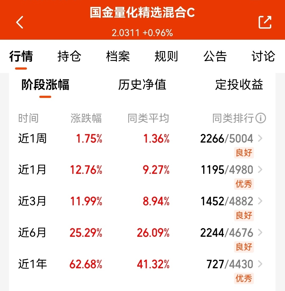 今天拿的$国金量化精选混合C$继续吃肉啦,最近限额放开了,各阶段业绩都挺稳,和国