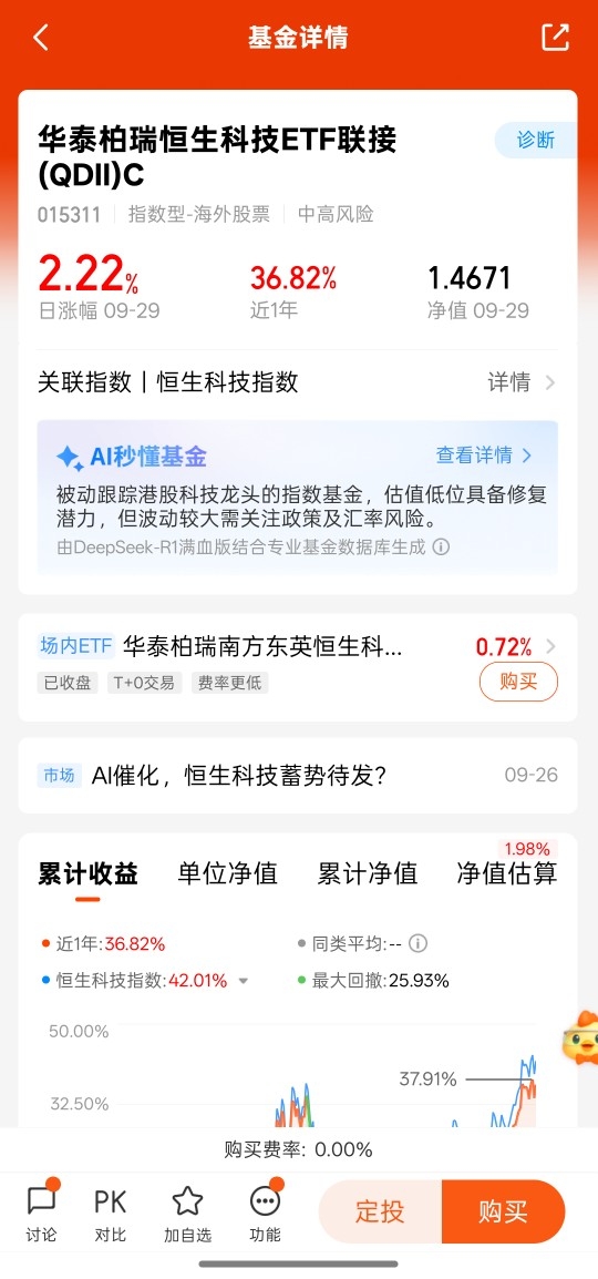 今天恒生科技算是给了个惊喜,A股收盘后就开始反弹,回了不少血,总算稳住了局面。国庆期间港股正常交易这事儿太关键了,去年假期那波行情谁不想赶上?现在这板块的支撑也足,美联储降息让资金更愿意流向科技股,国内AI发展又快,龙头公司业绩都不错。普通投资者想上车,华泰柏瑞是个靠谱选择,它最近的表现有目共睹,近一个月的涨幅很给力,不用自己费心选个股。记住啊,这是中高风险产品,入市得量力而行。
