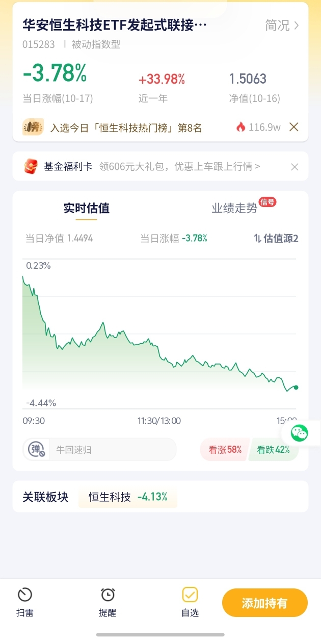 【华安恒生科技ETF发起式估值播报+10.17行情】今日预估跌幅-3.78%!收益提前看+恒生科技板块下探. 今日A股市场新能源、科技板块跌势汹汹,半导体、新能源车领跌,债基小幅上涨,投资伙伴们要多关注变化。