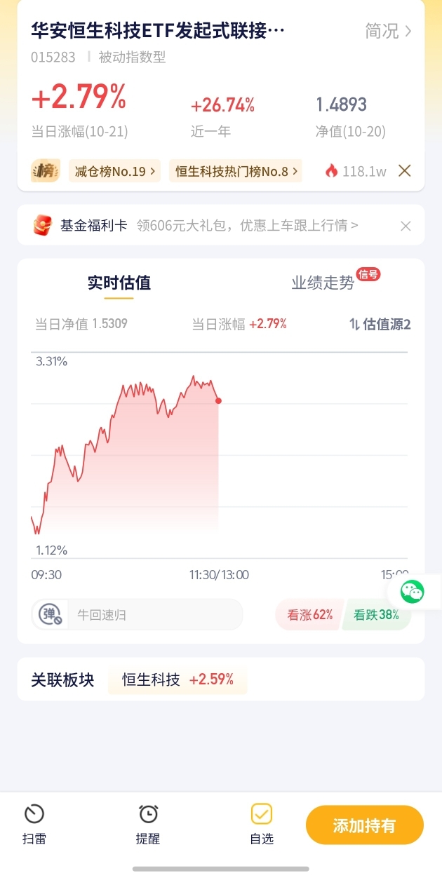 华安恒生科技ETF发起式今日预估涨幅+2.23%!恒生科技今天挺给力,科技爱好者可以关注下~
