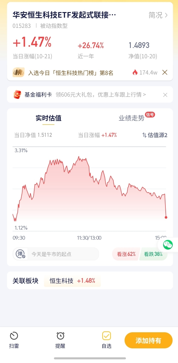 华安恒生科技ETF发起式今日预估涨1.49%!港股科技板块今日给力,这只ETF顺势上涨,关注港股科技的可以瞧瞧~