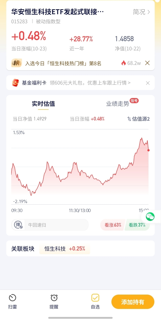 华安恒生科技ETF发起式今日预估涨幅+0.48%!恒生科技板块有所反弹,该基金在自选中呈现正收益,关注港股科技的可以留意~
