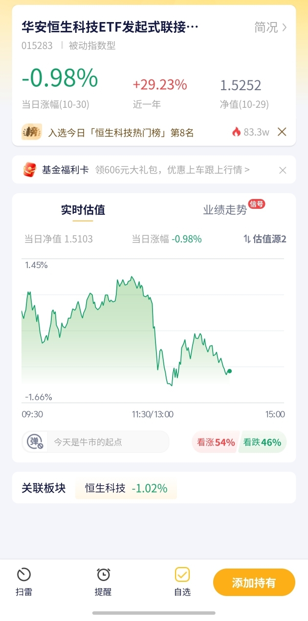 华安恒生科技ETF发起式今日预估涨幅-0.99%!恒生科技板块表现疲软,该基金在自选榜中表现不佳。