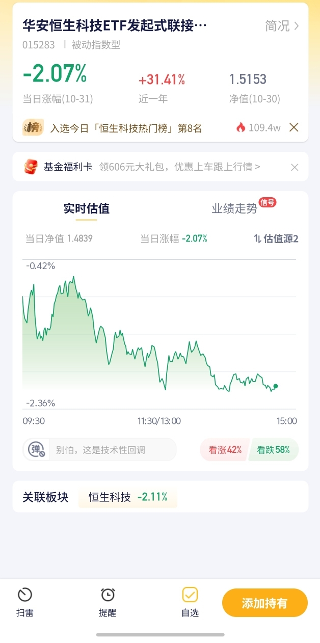 华安恒生科技ETF发起式今日预估涨幅-2.07%!恒生科技板块调整,短期承压。