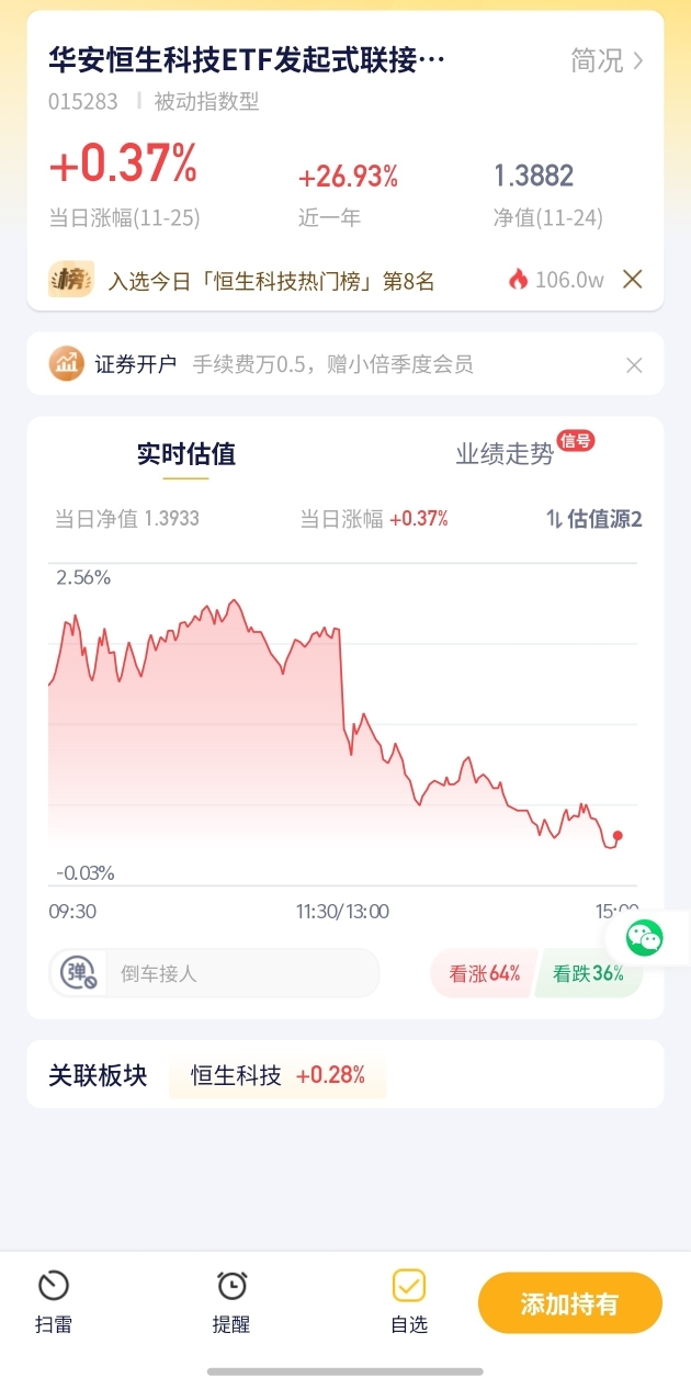 华安恒生科技ETF发起式联接C今日预估涨幅+0.28%!恒生科技相关方向有小幅发力,在自选里实现了正增