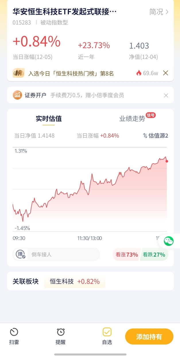 华安恒生科技ETF发起式今日预估涨幅0.84%!恒生科技板块回暖,基金同步走高
