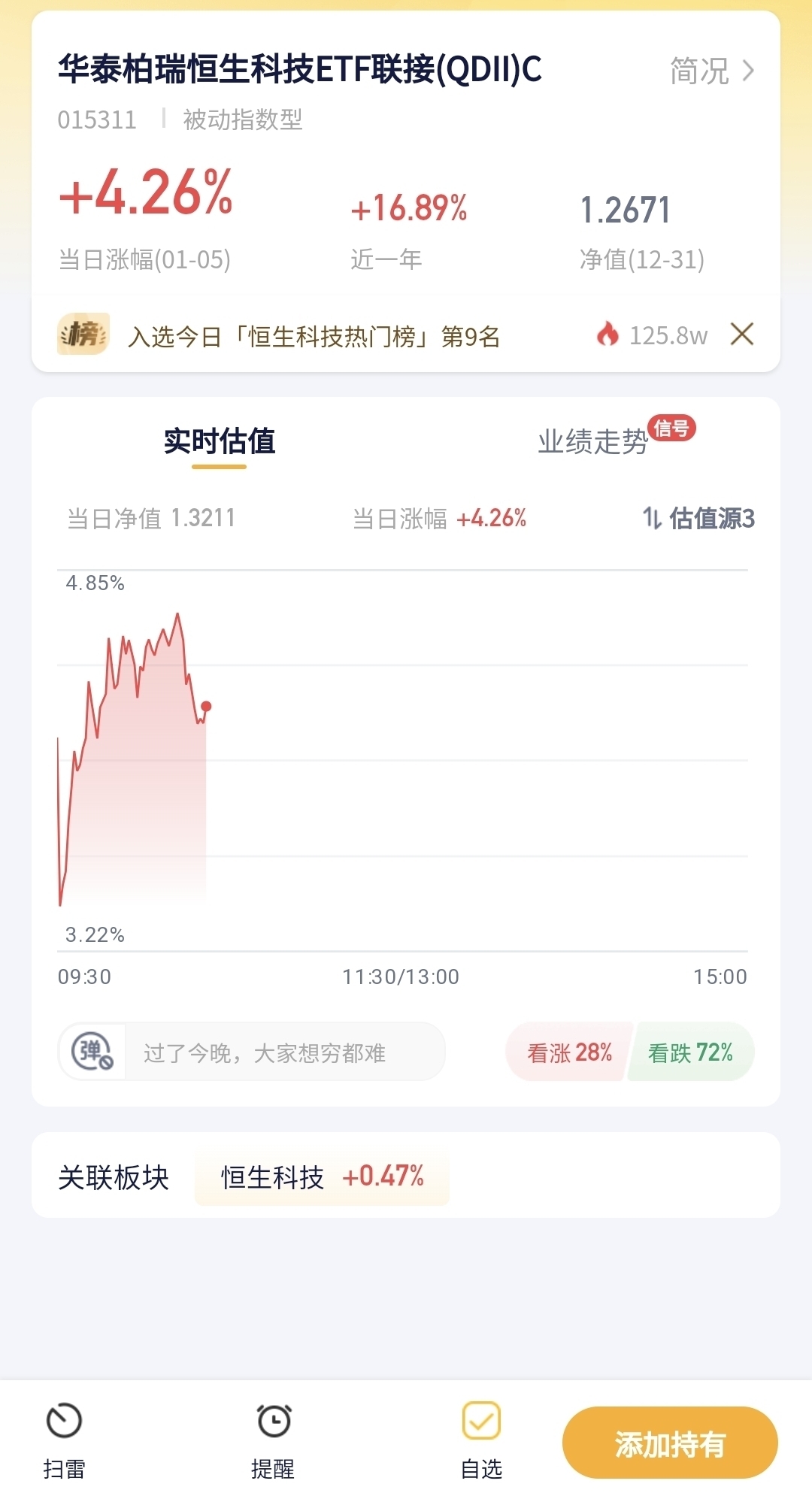 最近关注到恒生科技估值不算高,还迎来了4%的大涨,业绩和估值都有修复空间。我准备小仓位布局华泰柏瑞,它紧跟恒生科技指数,覆盖的都是优质科技企业,既能分享行情红利,风险也相对可控,挺适合稳健型投资者的。