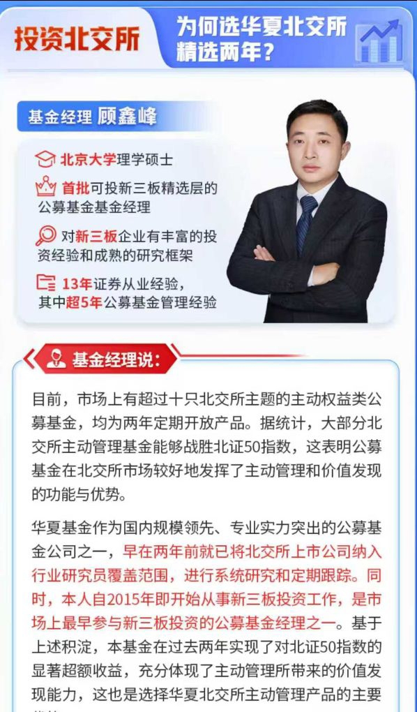 偶然间发现$华夏北交所精选两年定开混合发起式$,近3年240%+,跑赢北证50指数200%,这个基金经理顾鑫峰有新三板工作经验,对北交所研究更加深刻,专业的事还是交给专业的人来干吧,我就等着长期收益得了