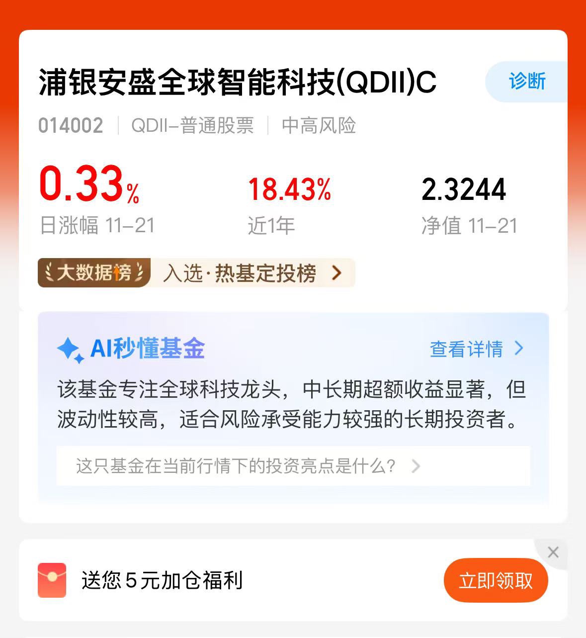 美股科技基金现在限额严重,主动型额度比较充足,浦银安盛全球智能科技每天单份额还有1万额度,别光盯着限额10块100的指数了!$浦银安盛全球智能科技(QDII)C$