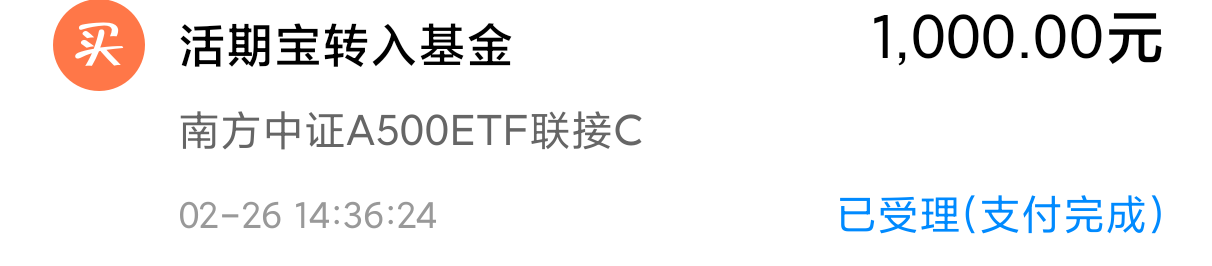 加仓,今天继续补一补,买进1000的 $南方中证A500ETF联接C(OTCFUND|022435)$