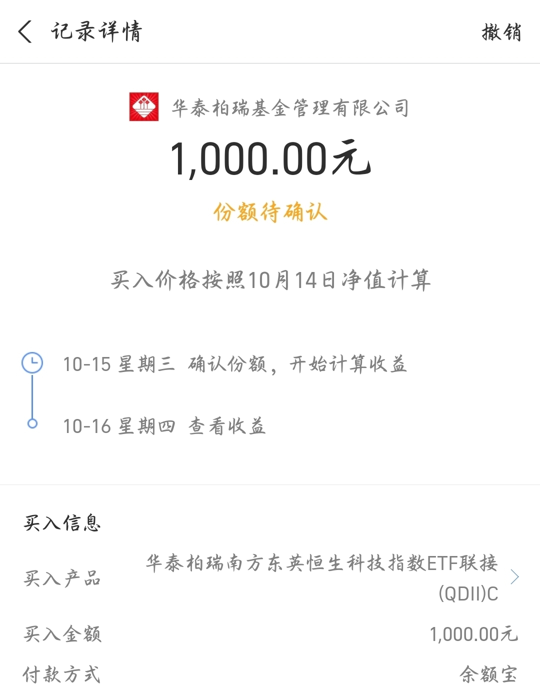 港股又回调,华泰柏瑞恒生科技C今日我果断补仓1000元,。恒科历史规律是“调得久,涨得猛”,阿里腾讯长期没问题,现在26.10%的年涨幅只是起点,便宜筹码我抓紧捡。