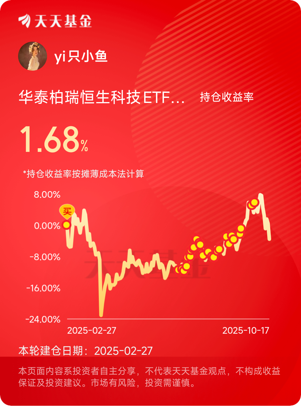 市场基本面向好,就是宽幅震荡消耗了投资者信心,当前要做的就是稳住仓位,别被洗下车,降息预期仍在,指数估值仍可期。华泰柏瑞这只费率优势明显,又是一只七免基到账快,长短期均合适,还是打算拿这只来跟进行情。