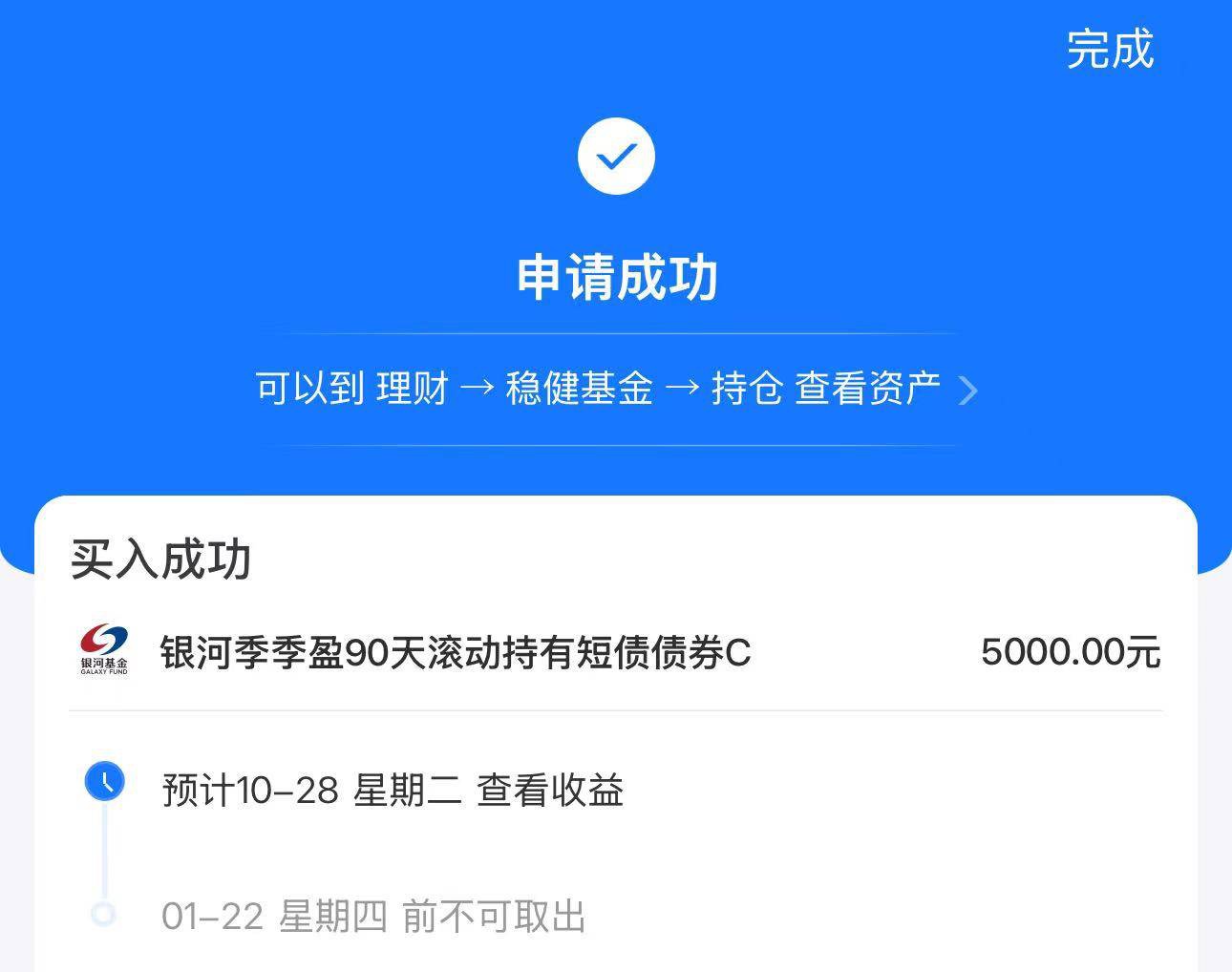 银河季季盈90天滚动持有短债债券C$银河季季盈90天滚动持有短债债券C$ 向来抗跌。近一年283个蛋。这只基持仓搭配得好,利率债和信用债平衡配置,近一年收益能有4.67%,平时每天慢慢涨,积少成多很可观。而且它是90天滚动持有,能避免瞎操作,还免申购赎回费。