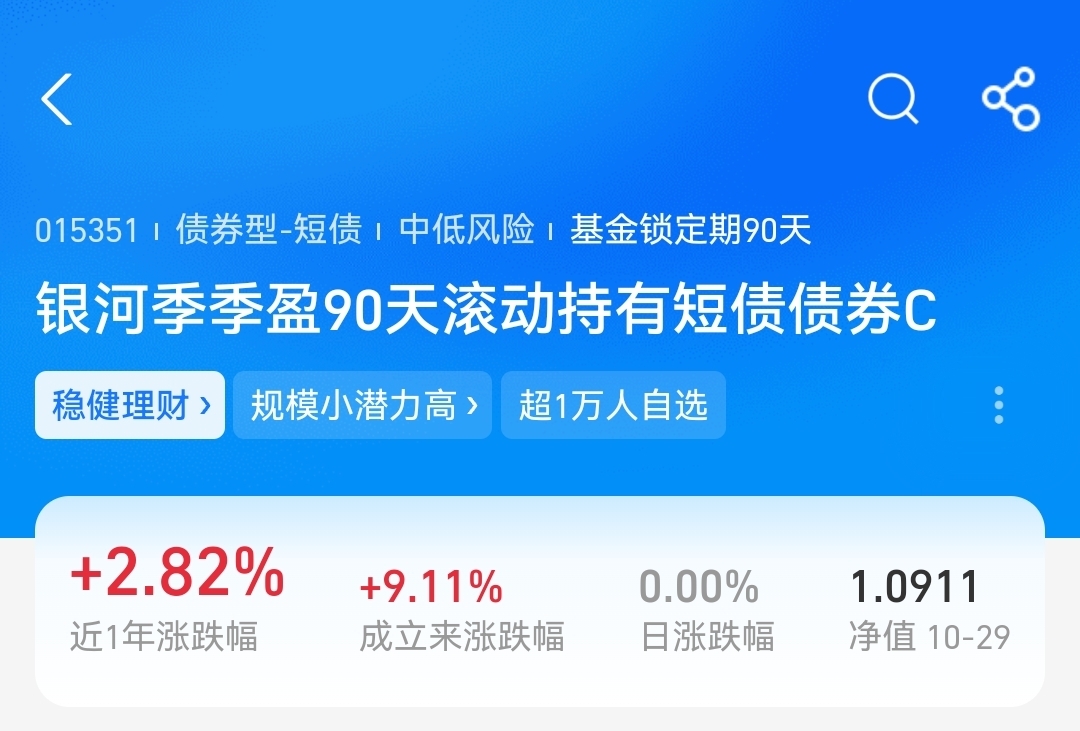 债市近期还是波动的,长债连连调整,短债还是比较稳的$银河季季盈90天滚动持有短债债券C$ 昨晚又稳住了,今天估值飘红,成立来涨幅9.11%,拿着真是美滋滋!