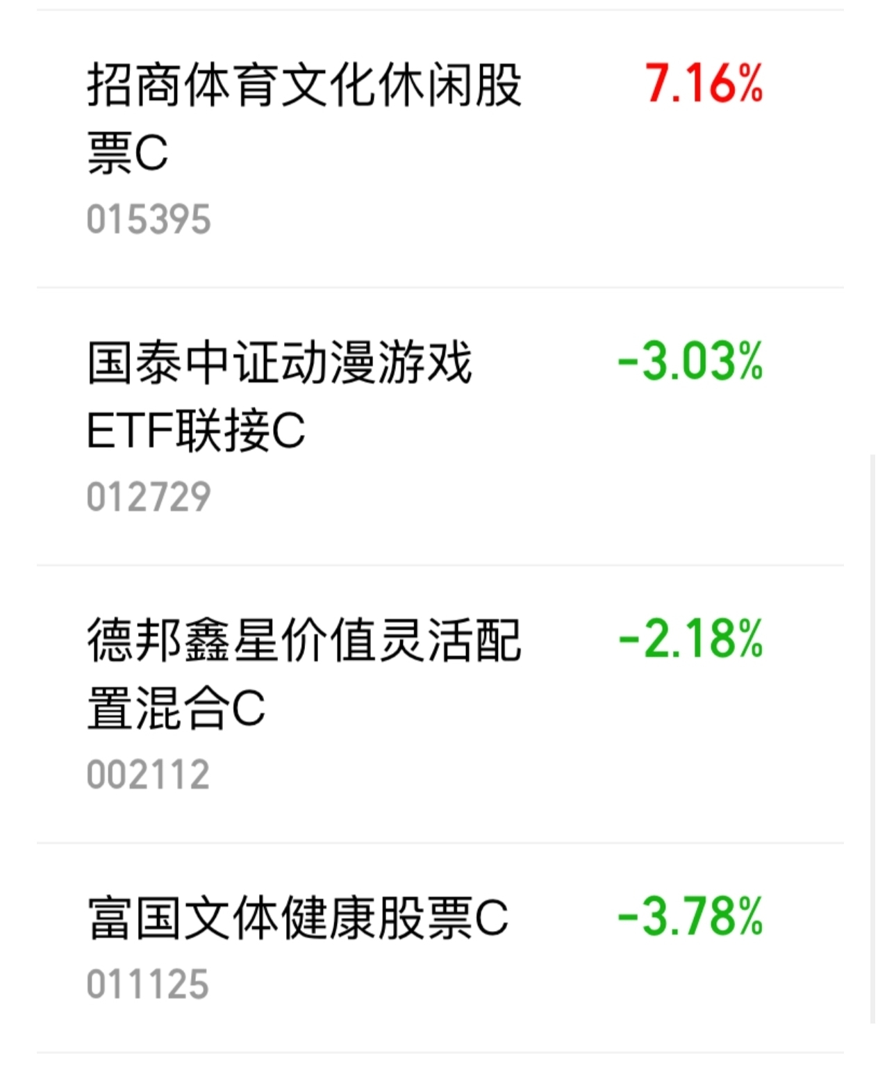 招商体育文化休闲股票C(OTCFUND|015395)这一个月涨了7.16%,表现最好。其他几只基金就没这么幸运了,国泰中证动漫游戏跌了3.03%,德邦鑫星价值灵活配置混合跌了2.18%,富国文体健康股票跌了3.78%。我自己主要拿着招商这只,其他几只暂时没碰。