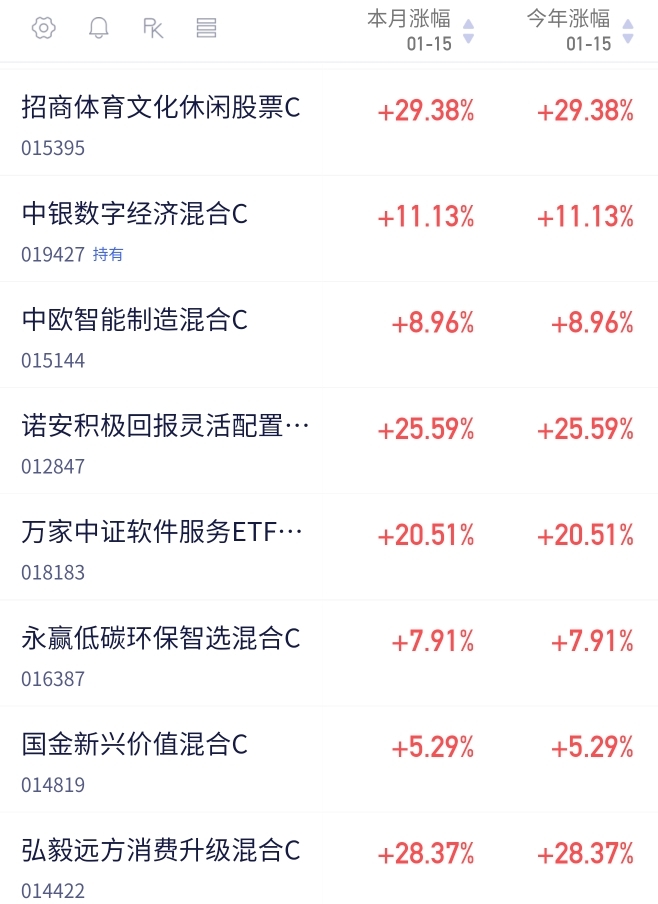 最近行情不错$招商体育文化休闲股票C$ 单日收益涨2.96%,2026年以来收益近30%,表现优秀。该基金盘子偏小,相较同类传媒基金弹性更足,更易捕捉板块红利。当前AI应用商业化落地确定性极强,其覆盖的体育文化、传媒相关标的深度受益AI赋能,产业趋势明确,后续行情持续看好。$中银数字经济混合C$ 11.13%