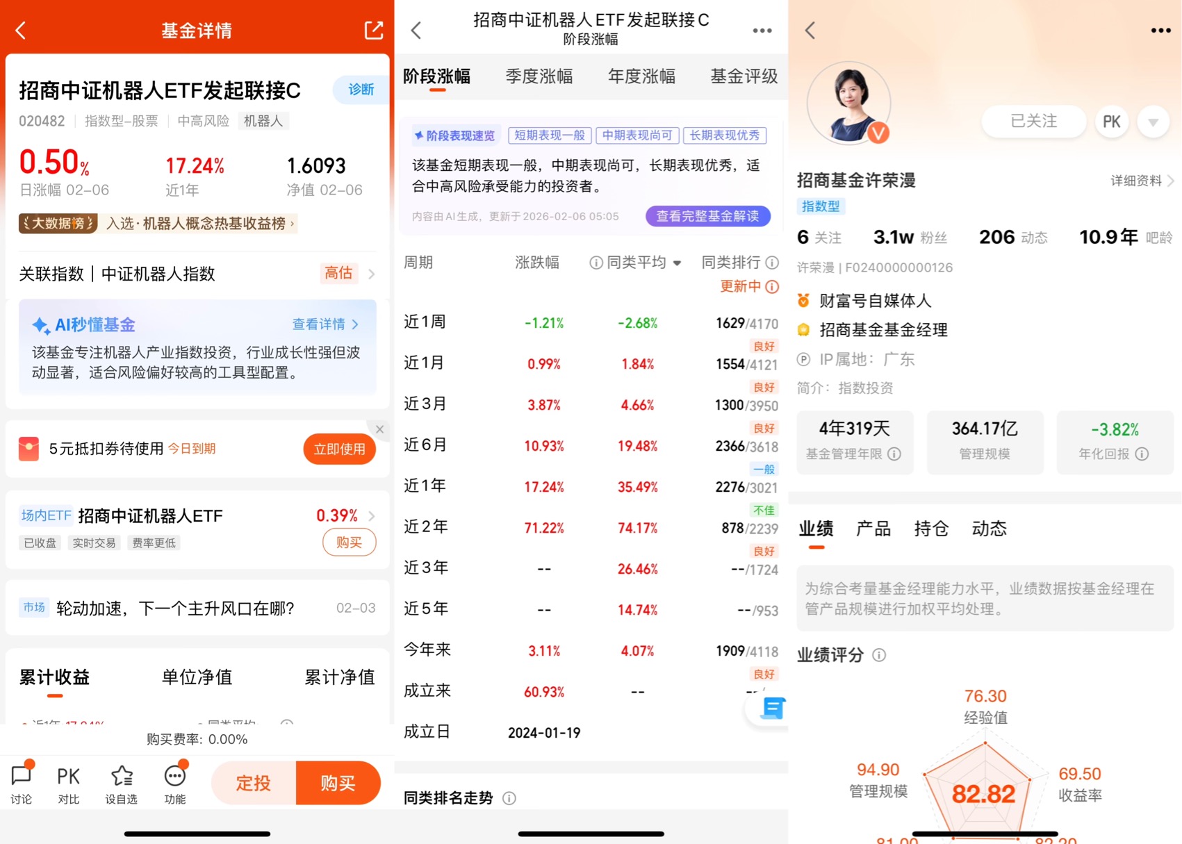 这是今年新发的基金,跟踪中证机器人指数,基金经理许荣漫在指数基金管理上经验丰富,管理规模超过360亿,是招商基金指数投资部的核心成员。