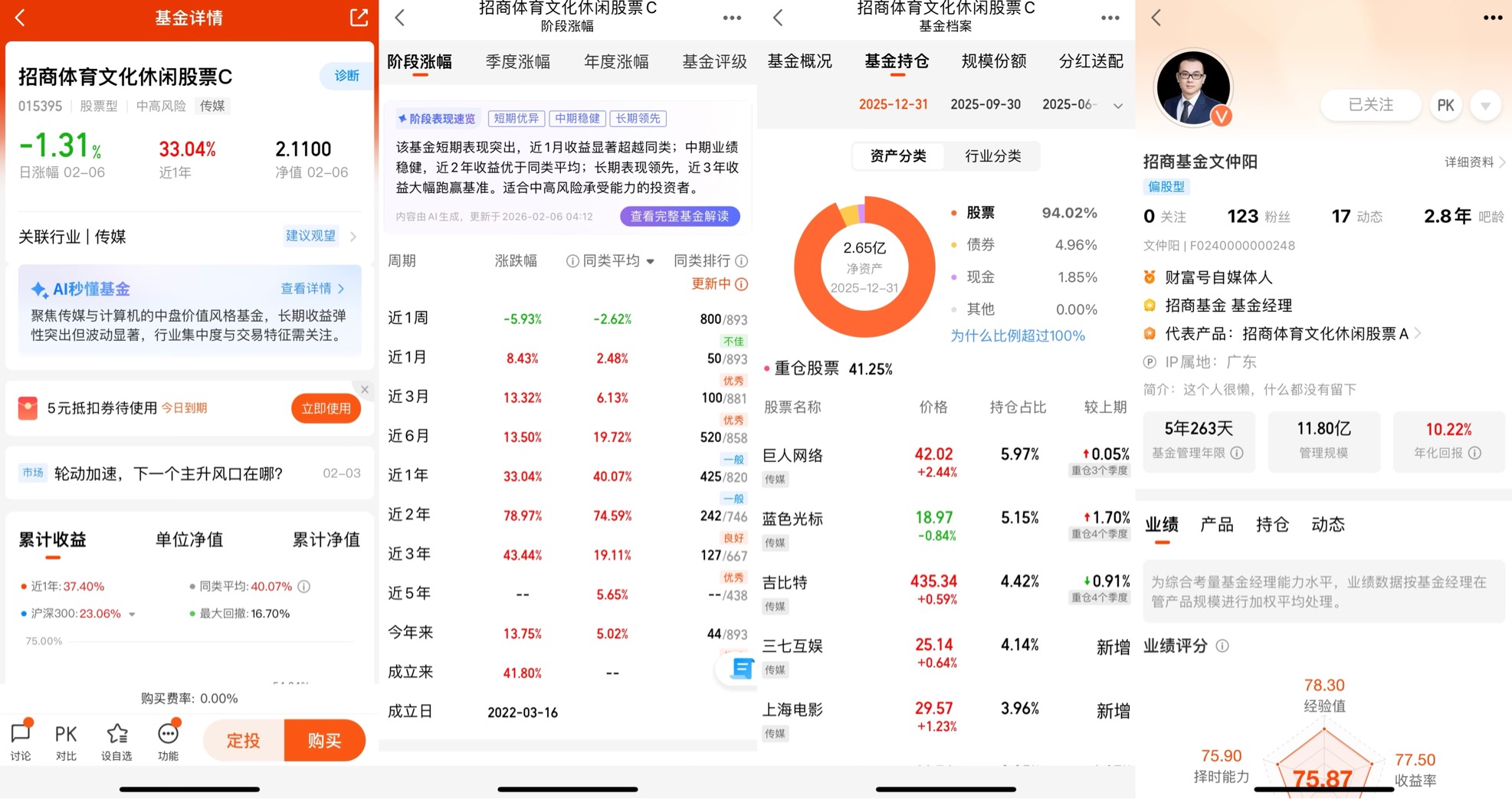 这只基金我关注了挺久,它表面上叫“体育文化休闲”,但实际上是一只披着消费外衣的AI传媒基。基金经理文仲阳是TMT行业的老兵,从业5年多,年化回报超过10%,这个成绩在科技基金经理里算是相当能打了。