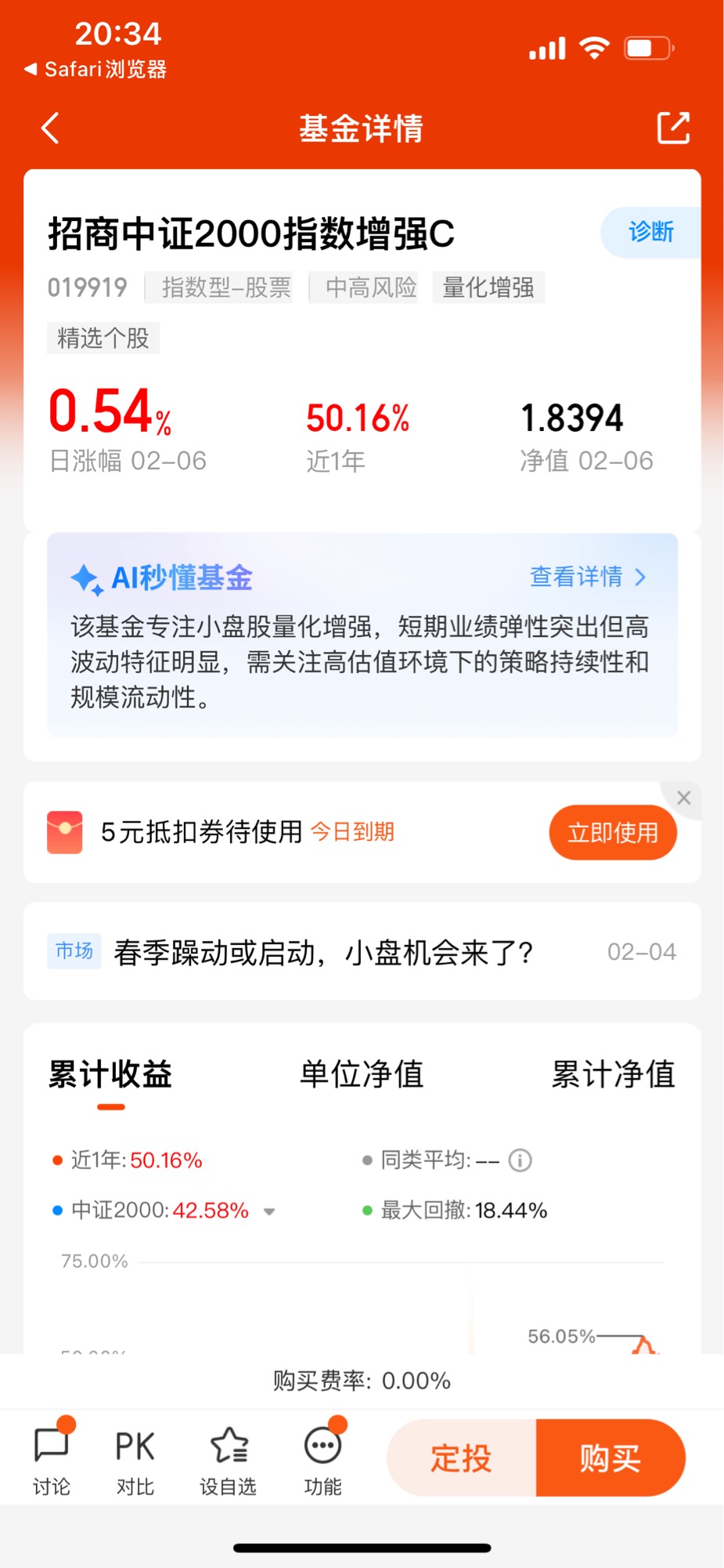 小微盘弹性十足:基金规模只有0.81亿,属于小微盘基金,船小好调头。这种规模在应对市场波动时非常灵活,遇到行情切换可以快速调仓,不会因为规模太大而影响交易效率。而且小微盘基金往往能挖到一些被市场忽略的小而美的公司,这些公司的业绩弹性可能比大盘股更大。