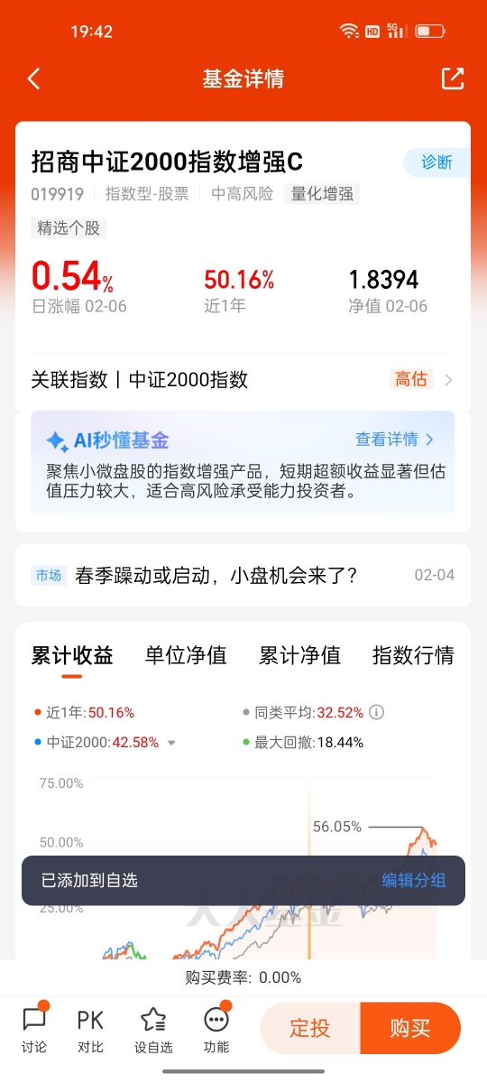 $招商中证2000指数增强C$ 就是把握AI+小微盘科创红利的绝佳选择,它不仅紧密跟踪中证2000指数,还通过专业的量化精选策略,在指数基础上筛选优质标的、优化配置,让收益跑赢指数本身。近1年50.16%的收益大幅超越指数37.74%的涨幅,2月6日0.54%的日涨幅也延续了稳健的表现,实打实的业绩印证了量化增强策略的有效性。