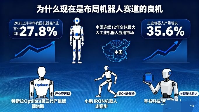 为什么现在是布局机器人赛道的良机?数据最具说服力:2025年上半年,我国机器人产业营业收入同比增长27.8%,工业机器人产量增长35.6%,中国连续12年稳居全球最大工业机器人应用市场。