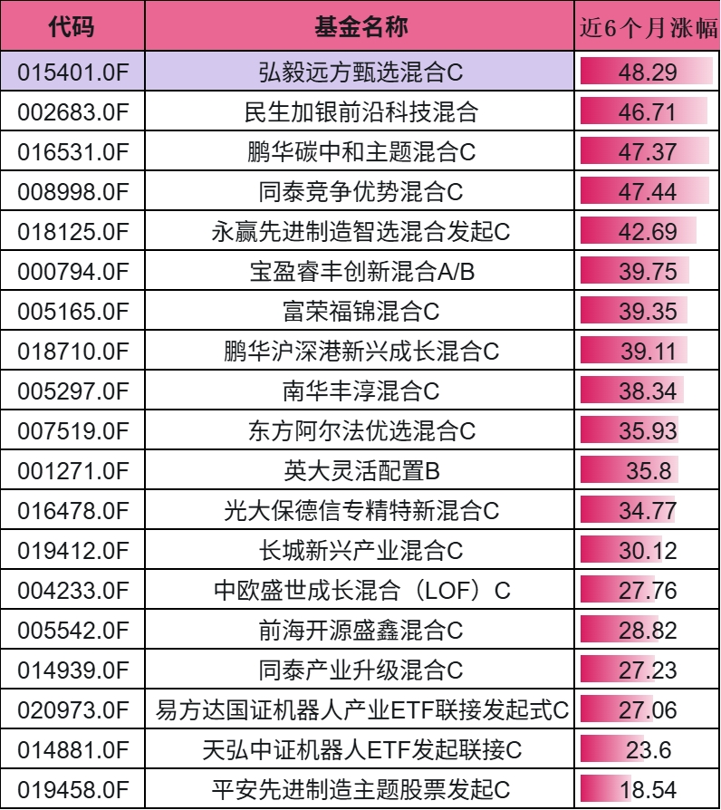 $弘毅远方甄选混合C$ 表现亮眼,近 6 个月涨幅达 48.29%,成绩十分突出。在当前市场环境下,精准布局助力超额收益。今日大盘强势上行,机器人板块同步走高,值得持续关注。