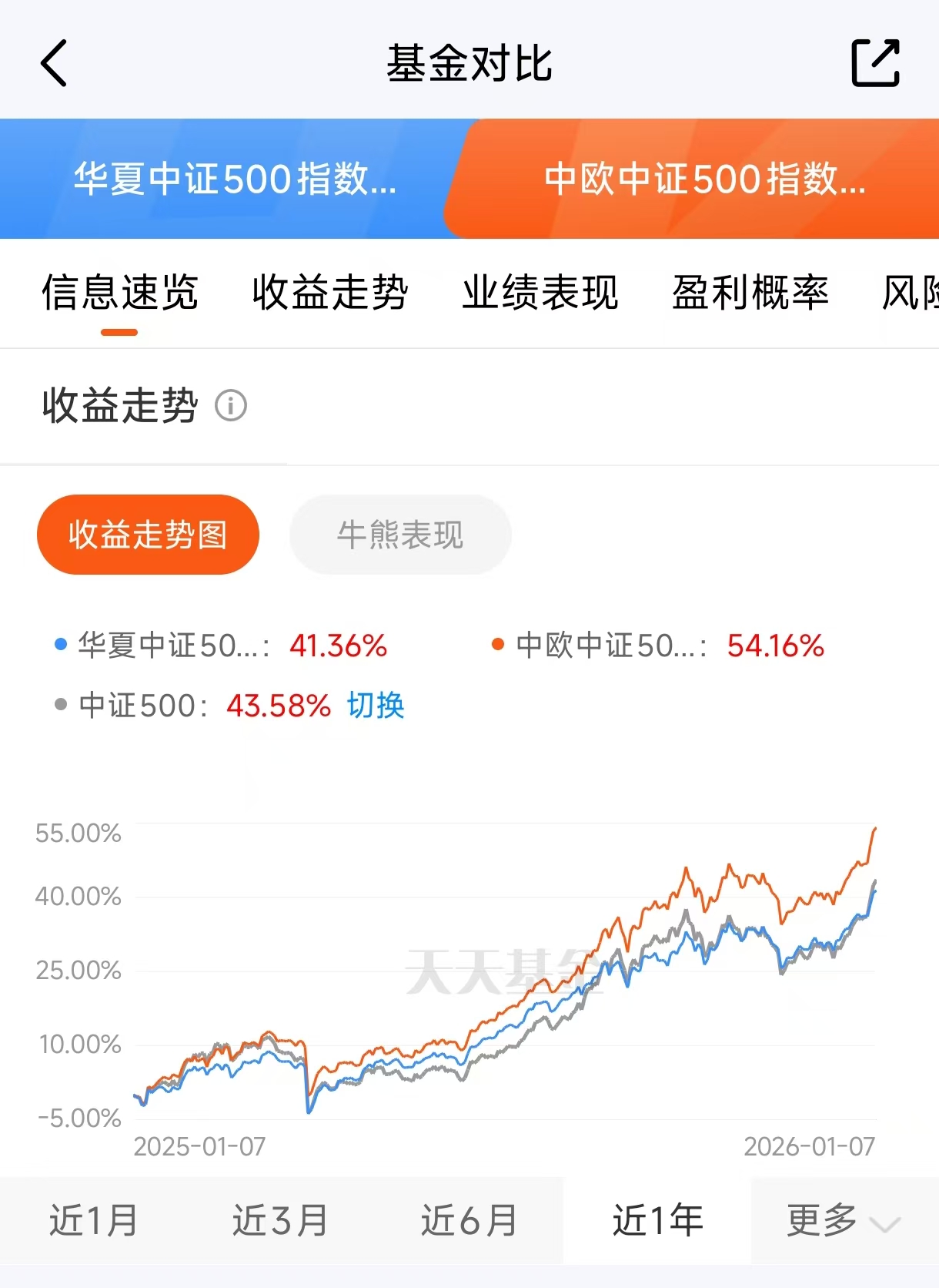 今天买了点$中欧中证500指数增强C$(015454),这基金近一年涨了54.16%,这个数在中证500增强产品里是顶尖水平。2025全年能涨42.48%,稳稳跑赢指数本身。你看像华夏中证500指数增强C(007995),近一年业绩就比它少了13个百分点,差距明摆着。这基金去年就是全市场同类里年度涨幅的冠军,今年看近一年涨幅还是第一,这种持续领先的增强能力确实不多见。它就花普通公募的钱,但增强效果能跟不少私募产品比划比划,而且买入没手续费,门槛也低,近一年54%的涨幅,这个成绩单好多私募的500指增都打不过。现在这种时候,中证500估值不高,里面公司既有传统行业的也有新兴领域的,分布得比较开,整体看机会不错。东西摆在这儿,看明白了就得动,好产品不会一直等着人。#沪指逼近4100点 上涨空间还有多少?#