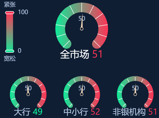 六、资金面情绪指数:全市场51 资金面紧平衡(0-100紧张度递增,50为均衡,超过50反映资金紧张)