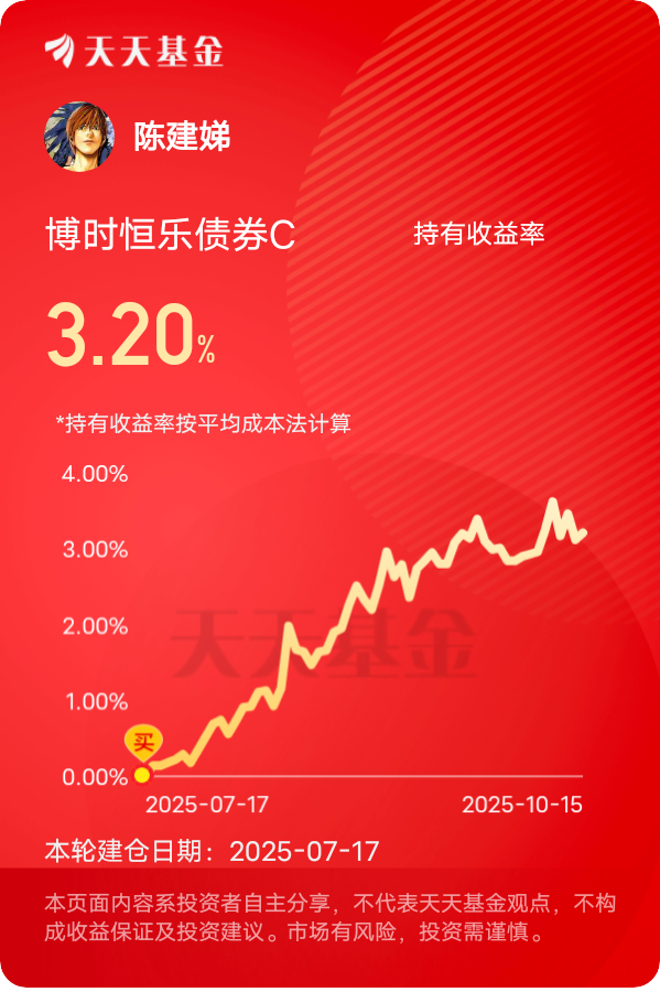 债市在经历三季度的调整后,走势趋于平稳,并且开始显现出向上的势头,$博时恒乐债券C$ 昨天又添了新收益,近三个月累计收蛋300多,半年下来产蛋已有660个,收益排名位于前列。这只基金没有申购费,持有满7天就免赎回费,平时急用钱随时能取,流动性比银行理财好太多。最近固收+基金正好迎来扩容周期,这只基金简直踩在了风口上。它的债券持仓特别多元,不仅有利率债,还有新能源车企的高等级产业债和可转债,既能靠利率债稳拿票息,又能靠产业债和可转债赚差价。尤其是可转债最近供需平衡,新增预案热度高,博时恒乐持有的品种正好受益。再看它的权益仓虽然不到20%,但选股眼光十分精准。前段时间布局了医疗创新和消费电子的细分龙头,这些板块估值低、业绩稳,最近正好迎来估值修复行情。更聪明的是还配置了国泰中证全指证券公司ETF,既分散了个股风险,又能享受券商板块的弹性收益。这种“个股+ETF”的搭配,把权益部分的风险控制得特别好,近一年最大回撤还不到1%,稳赚还不用操心。#存储芯片掀涨价潮!行业迎超级周期# #晒收益#