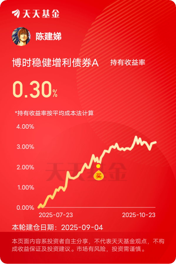 最近市场虽然有点波动,但$博时稳健增利债券A$ 真是稳得让人安心!不光连着红了好几天,三个月下来默默涨了3,21%,近一年直接攒下将近900个蛋,这细水长流的收益能力,拿着特别踏实。近期资金面越来越宽松了,央行这阵子动作不断,前几天刚放了1200亿1个月期国库定存,还加了2000多亿7天期逆回购,现在市场上的钱很充裕,隔夜和7天期资金价格都在往下走。对这只以债券为核心的产品来说,资金面宽松简直是直接的“营养供给”,债券收益率下行的时候,持有的老债估值自然会往上走,近期收蛋完全在情理之中。再加上它的权益仓配置特别聪明,不是盲目追高,基金经理精选了一些低估值的消费龙头股,最近消费板块慢慢企稳,这部分仓位刚好能贡献额外收益,形成“债券打底+权益增强”的效果。有些债基要么纯债到底收益太低,要么权益仓激进波动太大,这只基的平衡感把握得非常好。昨天债市微调,它反而逆势收蛋,股市小涨的时候也能喝口汤,这种灵活度太适合现在的震荡市了。#党的四中全会审议通过“十五五”规划建议# #晒收益#