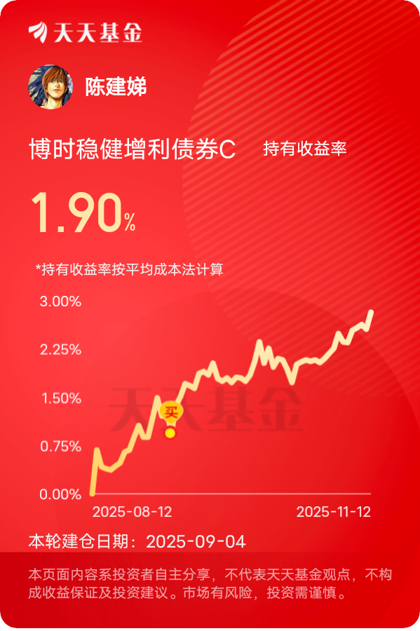 债市回暖,股市又强,固收+在当前市场,收益优势十分突出。$博时稳健增利债券C$ 单日收蛋25个,六个月累计产蛋下684个,近一年涨幅稳稳超过9%。近期央行重启国债买卖,10月净买入200亿元国债,这个动作从今年1月暂停后首次恢复,信号意义重大。中信证券分析了,这是央行在配合财政发力、稳定市场预期,市场会持续博弈后续买债规模,多头力量更容易凝聚。而博时稳健增利刚好踩中了这个节奏,债券仓位里 80%以上是高等级信用债和国债,其中短久期信用债占比超50%,既安全又能提供稳定收益。而且基金经理还会灵活用杠杆策略,在资金面宽松时适度加杠杆,进一步放大收益,这也是最近净值能快速上涨的关键因素之一。再看它的权益部分,其爆发力完全超出预期,基金经理精准布局了军工和汽车零配件板块。其中中航沈飞、中直股份这些军工股,受益于行业景气度提升,近期涨幅很大;还有汽车零配件龙头福耀玻璃,随着新能源汽车销量增长,业绩持续超预期,直接给基金贡献了不少收益。更难得的是权益仓位始终控制在20%以内,有效的降低了风险,这小仓位博高收益的策略很求稳又想赚的。#科技热点摊开业啦# #晒收益#