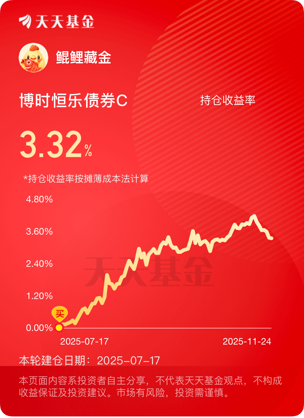 震荡市里,固收+就是那种能打能扛的选择,债券作为盾,防御性强;权益作为剑,有机会就进攻。$博时恒乐债券C$ 在一众固收+产品里更是相当能打。其六个月收益以有55.45%,10月底还分红了,相当于额外给了现金返利。近期还将申购上限从500万元调整至100万元,是典型的在规模与业绩间寻求平衡的举措,旨在维持策略容量的舒适度,利于长远运作。近期财政部投放2000亿国库现金管理定期存款,直接给银行体系注入短期流动性,银行手里有钱了自然会加大债券配置,博时恒乐持仓的AA+以上高等级信用债和国债肯定会更抢手,安全性拉满还能享受信用利差收窄的红利。其权益部分的配置更是点睛之笔,没有盲目追高,而是选了高股息红利和周期改善板块,简直戳中稳健投资者的心。持仓里的中国神华股息率高达7.5%,在国企分红政策强化的背景下,每年都能拿到稳定分红,相当于给收益上了保险。且现在股债市场都处于相对低位,债市有流动性支撑企稳回升,股市的估值也很有吸引力,博时恒乐既能靠债券稳住收益,又能通过权益仓捕捉股市反弹的机会,现在布局时机绝佳。#今年买基金赚了多少钱?#