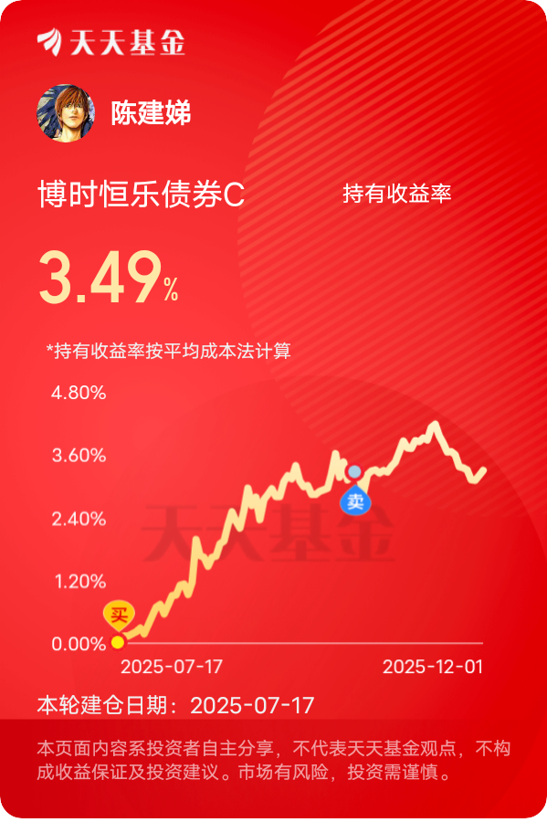 债市回暖,$博时恒乐债券C$ 表现亮眼,连红两天收蛋将近20个,近半年累计涨了5.4%,业绩排名稳居同类产品前列。近期其单日限额降到了100万,这波规模控制为基金的长期稳定运作夯实了基础。近期有两个利好催化了业绩,一是金融支持融资平台化债政策落地,潘功胜行长明确要建化债框架,给地方债"排雷",基金重仓的城投债安全性大幅提升;二是美联储10月降息后中美利差收窄,外资回流国内债市,利率债品种受益明显,基金持仓里的25国开06、23附息国债等价格稳步上涨。这只基金债券部分占比高,但不是死守,久期灵活调整,三季度债市调整时逆向加仓,现在吃到了收益率下行的红利。它的权益仓更是亮点,虽然股票仓位占比只有20%左右,但行业分散加个股集中,最近爆发的热点一个没落下:比如有色金属里的铜陵有色和传媒里的世纪华通,受益于新能源车用铜需求以及政策支持数字文化,这些板块在三季度科技行情中贡献了不少超额收益。还有经理积极调仓,比如8月减仓算力股,转战贵金属和风电,踩点很准。现在A股在3900点附近,红利股和科技股轮动,恒乐“债券抗跌+权益跟涨”的双保险策略,尤其适合当前分化市,对接下来表现有信心!#今年你的投资目标达成了吗?# #晒收益#