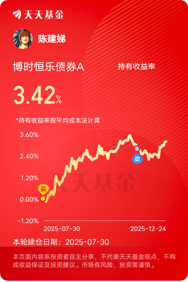 这阵子市场起伏反复,$博时恒乐债券A$ 却像一块压舱石,净值走得很稳,昨天收了3个蛋,半年下来积累了474个蛋的收益,业绩很能打。这基最近还把大额申购的门槛从500万降到了100万,感觉经理是想控制好节奏,细水长流,专心把净值曲线画得更漂亮。12月政治局会议定调的“宽财政+宽货币”政策,明确要保持流动性充裕、促进融资成本下行,这对债基来说就是最扎实的后盾。而且12月22日央行重启14天期逆回购,专门呵护跨年流动性,避免年末资金紧张,这直接保障了短端利率债的收益稳定性,而博时恒乐A的债券仓位里,政策性金融债、超长期特别国债等利率债占比超65%,正好精准吃到了这波政策红利。其权益仓位占比不超过20%,确是点睛之笔!既能增厚收益又不冒大风险,重点布局了高股息蓝筹股,像煤炭、石油石化这些板块,既能抗住股市震荡,又能拿到稳定分红。现在股市在3900点附近徘徊,正是布局好时机,既能靠债券打底稳赚票息,又能靠权益仓位赚点超额收益,坐等行情带飞就行!#新年观察局:2026我看好的投资赛道# #晒收益#