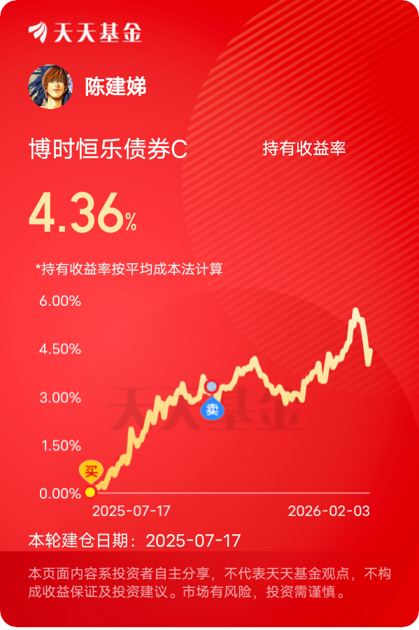 这波必须给$博时恒乐债券C$ 点个赞!债券部分铺得扎实,股票还碰上了好时机,权益仓里的金融、有色、化工昨天都又表现。单日收蛋39个,半年累计超过380多个蛋,短跑能冲刺,长跑也不掉链子。最近债市的大环境相当友好,1月23日央行开展的9000亿元1年期MLF,净投放规模创近期新高,这波又买断式逆回购8000亿,直接释放了流动性充裕的强烈信号。而且央行行长还重申今年降准降息还有一定空间,这对债市来说就是长期利好。这基债券仓位一直保持在高位,主要配置的是高等级信用债,这类债券违约风险低,还能稳定获取利息收益。昨天的这波收益爆发,核心是权益仓的给力表现,这基的资源股布局真的太绝了,藏格矿业、盐湖股份、中矿资源这些个股全在列,昨天正好赶上资源板块走强,直接带动了基金收益飙升!藏格矿业作为锂资源龙头,随着新能源行业的复苏,锂价近期持续回暖,公司的业绩预期也在不断提升,股价自然水涨船高;还有盐湖股份,坐拥国内最大的盐湖锂资源,成本优势明显,近期随着产能释放,业绩有望持续增长。基金经理布局了这类估值低位、业绩有支撑的资源,既避免了高位站岗,又能在板块轮动时收获惊喜!#2月基金投资策略# #晒收益#