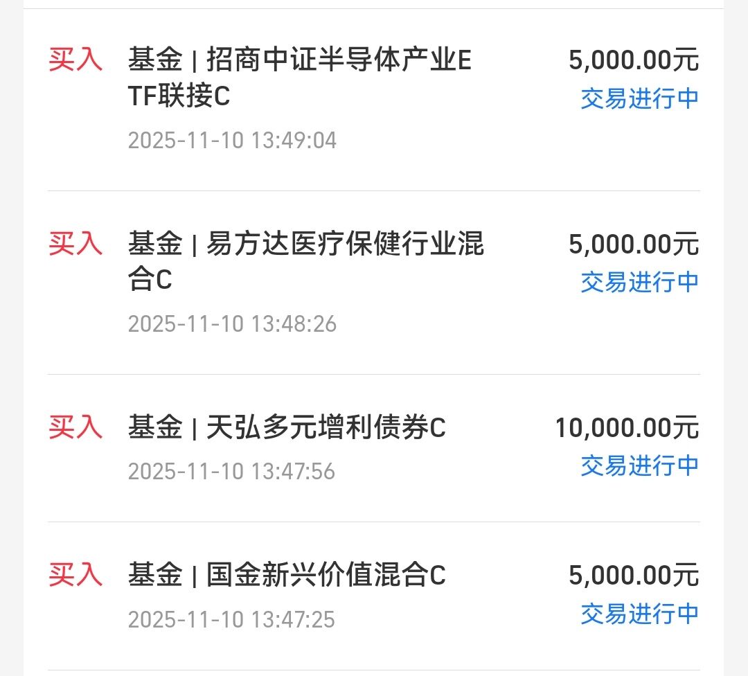 我今天加仓了半导体、医药医疗、天弘多元增利、国金新兴价值,其它基金继续持有待涨。