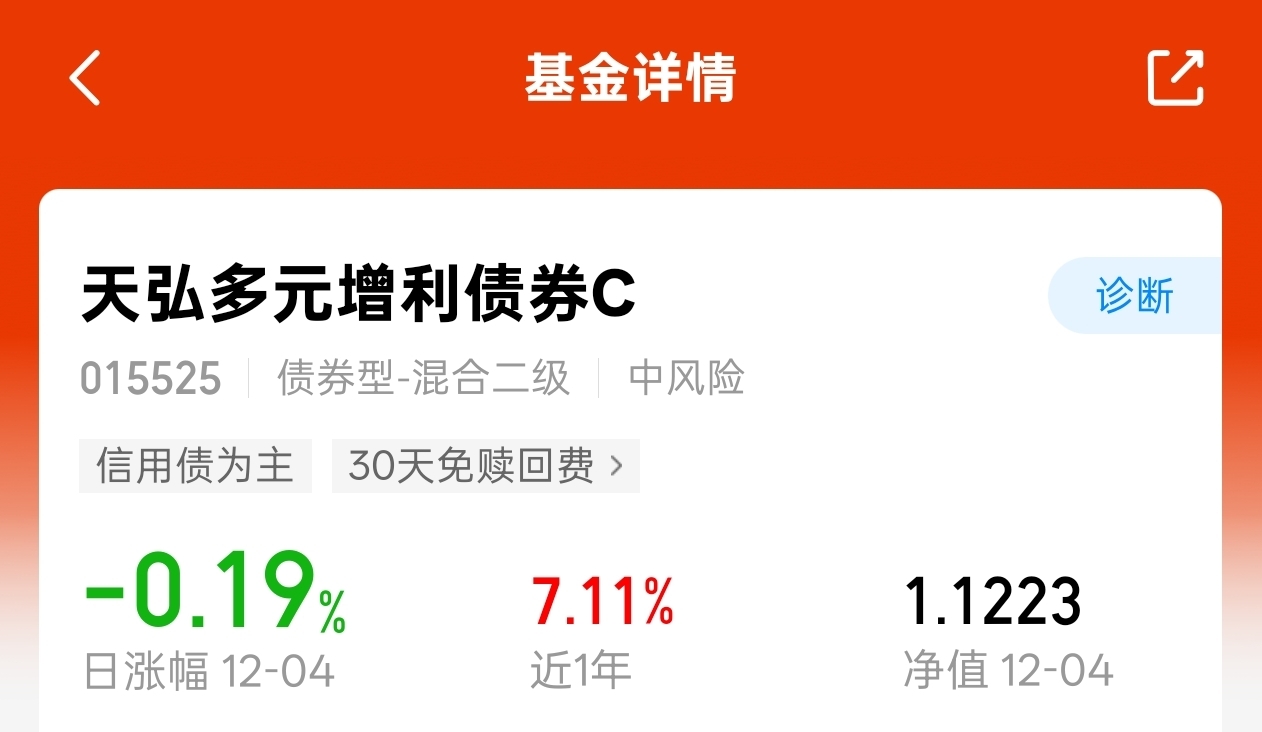 $天弘多元增利债券C$ 今天建仓10000元,它是一只以债券打底股票增强的稳健型固收+产品,从持仓来看,债券占比94.58%搭配19.01%的股票,非常适合现在股债轮动的行情,而且它的股票主要持仓也是我看好的银行和红利两个方向,未来低利率时代下持有银行和红利,收益会更好一点,它近三个月收蛋200个,近一年收益率也是达到了7.11%,比很多纯债基金收益更好,而且回撤也不大,我正好在讨论区还领到了红包,今天先上车10000元,期待它后面的表现,加油!