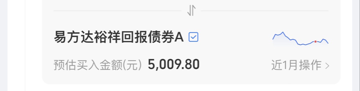 $易方达裕祥回报债券A$ +5K,今年债市比较震荡,单一配置的话收益一般,股市目前还在慢牛,如果不喜欢股基这种高波动的,我觉得固收+性价比相对下来还是比较高的。今天继续补仓一笔易方达裕祥回报债券A,它是一只中波固收+,大仓位纯债为稳健底仓,搭配了19.49%的股票+5.44%可转债增强收益,股市前段时间回调,它的回撤也是比较亮眼的,业绩上看近一年上涨了5.54%,今年来涨幅4.94%,比纯债还是要高出不少,属于老牌绩优基,成立快10年了,年年都是正收益,今天我再补仓一笔拿长期。