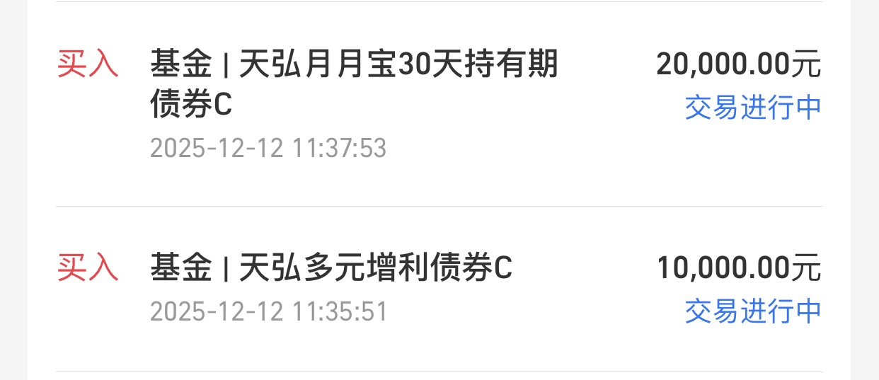 $天弘月月宝30天持有期债券C$ 加仓20000元。近期市场波动依然较为频繁,今天我继续定投补仓天弘月月宝30天持有期债券C,它是一支采用纯债策略的稳健型短债,持仓以信用债为主,在相对稳健的基础上还叠加了一部分利率债作为辅助,在市场波动的时候,防守底仓的部分来平缓波动,行情回暖的时候,利率债部分也可以增厚部分收益。它给我的持仓体验就是比较稳,近半年收了98个蛋,我把它作为余额宝的平替,收益也还不错,感觉还蛮省心的。今天我继续用上讨论区的菜包,再递增20000元。
