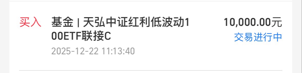 $天弘中证红利低波动100联接C$ +1W,最近市场变化还是比较快的,资金风格上属于来回切换,红利我看了下在前段时间调整了比较久,这几天也开始迎来了修复,相比部分成长股的高位,我觉得红利板块性价比相对还是比较高的,目前处于较低的位置。今天继续补仓一笔天弘中证红利低波动100ETF联接C,它主要是跟踪中证红利低波100指数的,聚焦了高股息,高分红的特性,我今天再定投一笔进来。
