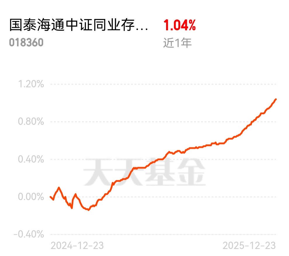 年底资金回笼,债市震荡不停,手里的理财都跟着慌。债又开跌?我还是回国泰海通中证同业存单躲躲,相对安全一点!近 6 个月 0.64% 的收益靠谱,AAA 评级存单打底,风险更低。